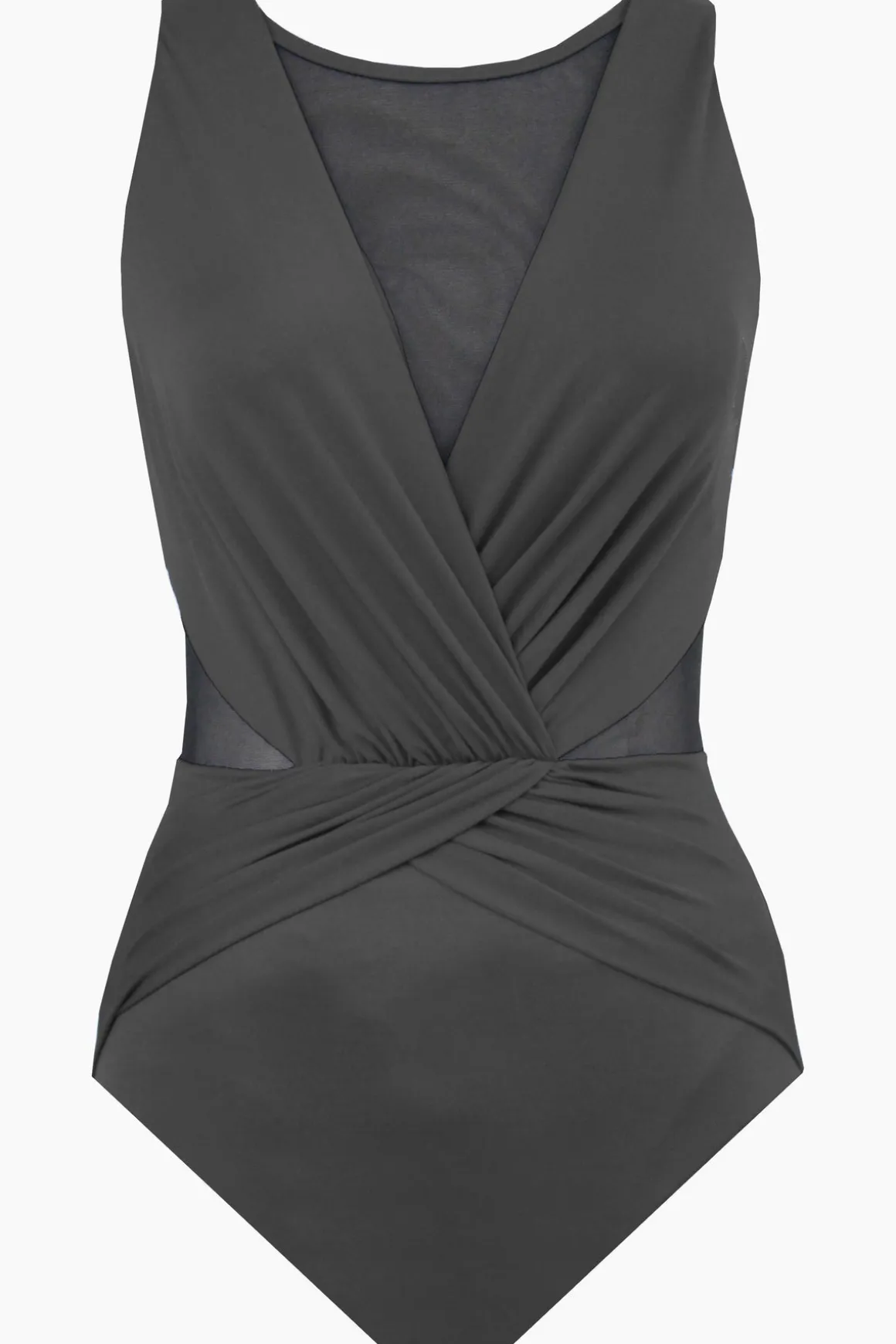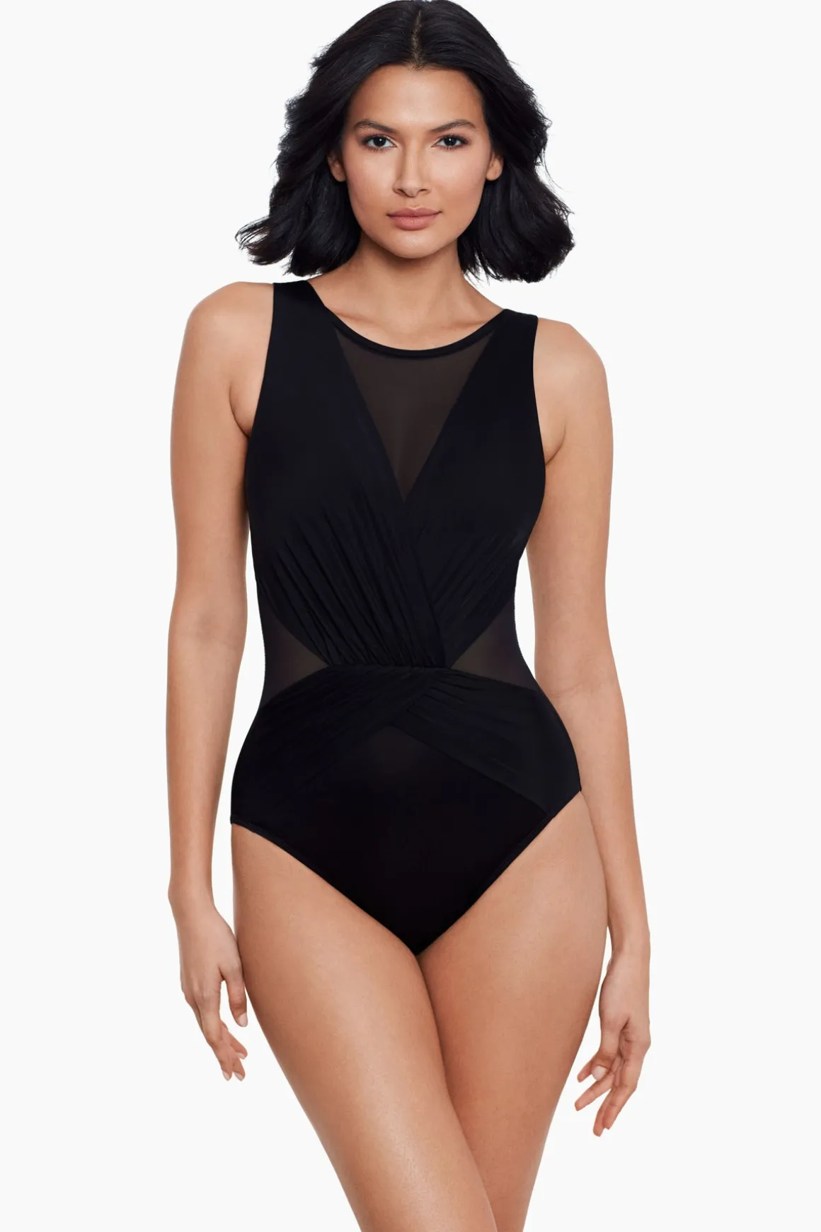 • Look 10 lbs. Lighter In 10 Seconds® With Miraclesuit• Soft Cup Bra• Bra Can Accommodate Up To A D-Cup• Maximum Coverage For Décolletage• High Neckline• Fixed Straps• Scoop Back• Mesh Insets Provide Streamlined Control and Hourglass Waist• Miratex Fabric Provides Allover Body Control• Shapes And Slims• Moderate Leg Cut• Natalie Is 5’10” And Wearing A Size 8• Drape: 82% Nylon, 18% LYCRA® Spandex• Body: 69% Nylon, 31% 18% LYCRA® Spandex• Complete Your Look With A Matching
