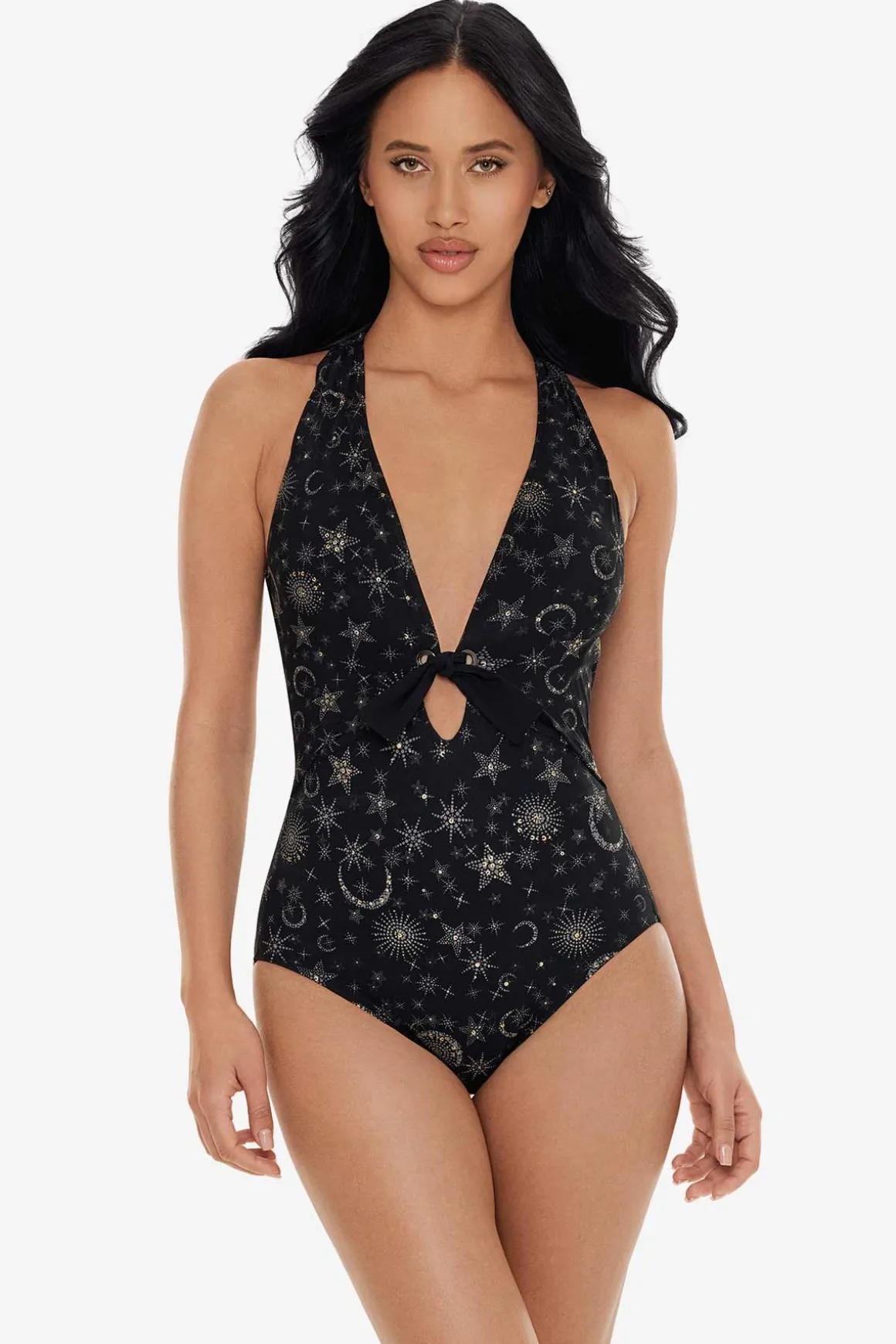 • Soft Cup Bra• Bra Can Accommodate Up To A D-Cup• Plunge V-Neckline• Cross Back Straps For Added Support• Provides Allover Slimming & Shaping• Moderate Leg Cut• Tie Detail At Empire Accented With Smokey Silver Grommets, Accentuates Hourglass• Model Is 5’11” And Wearing A Size 8• Body: 73% Nylon, 13% LYCRA® Spandex• Lining: 69% Nylon, 31% LYCRA® Spandex• Complete Your Look With A Matching • Like This Silhouette? View All Colors And Prints For