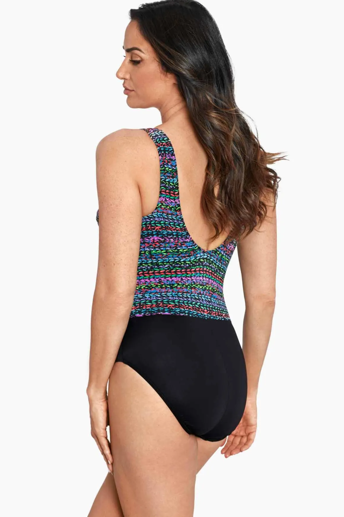 • Look 10 lbs. Lighter In 10 Seconds® With Miraclesuit• Underwire Bra • High Neckline • Fixed Straps • Scoop Back • Moderate Leg Cut• Donna Is 5’10” And Wearing A Size 8 • 69% Nylon 31% LYCRA® Spandex• Complete Your Look With A Matching